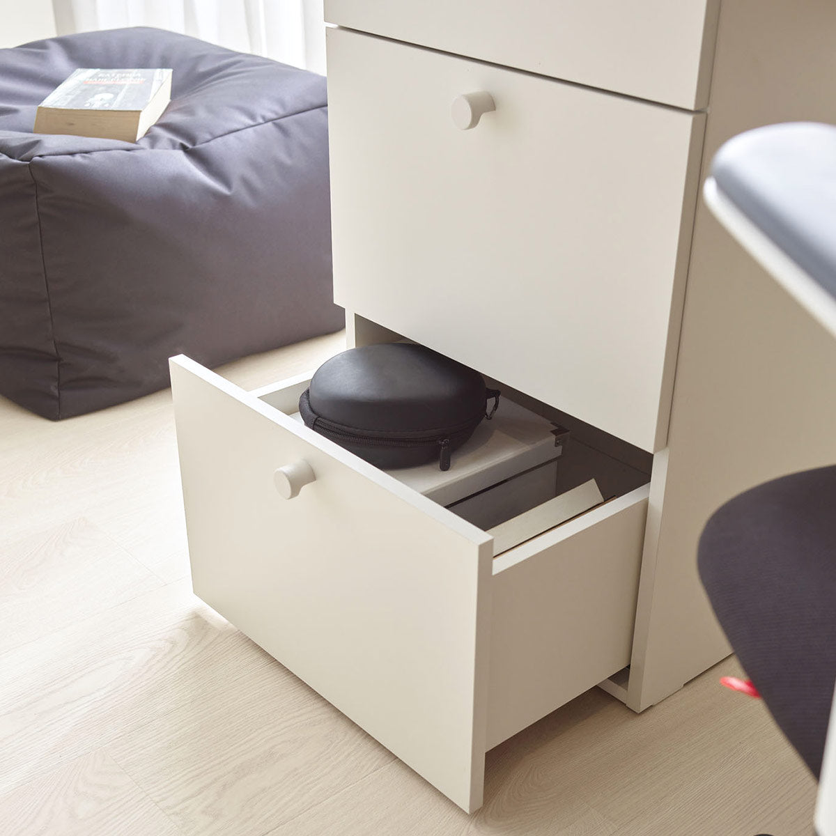 Горното фиока е ниско, идеално за ситни предмети, а другите две долни фиоки се високи - можат да соберат книги или класификатори.