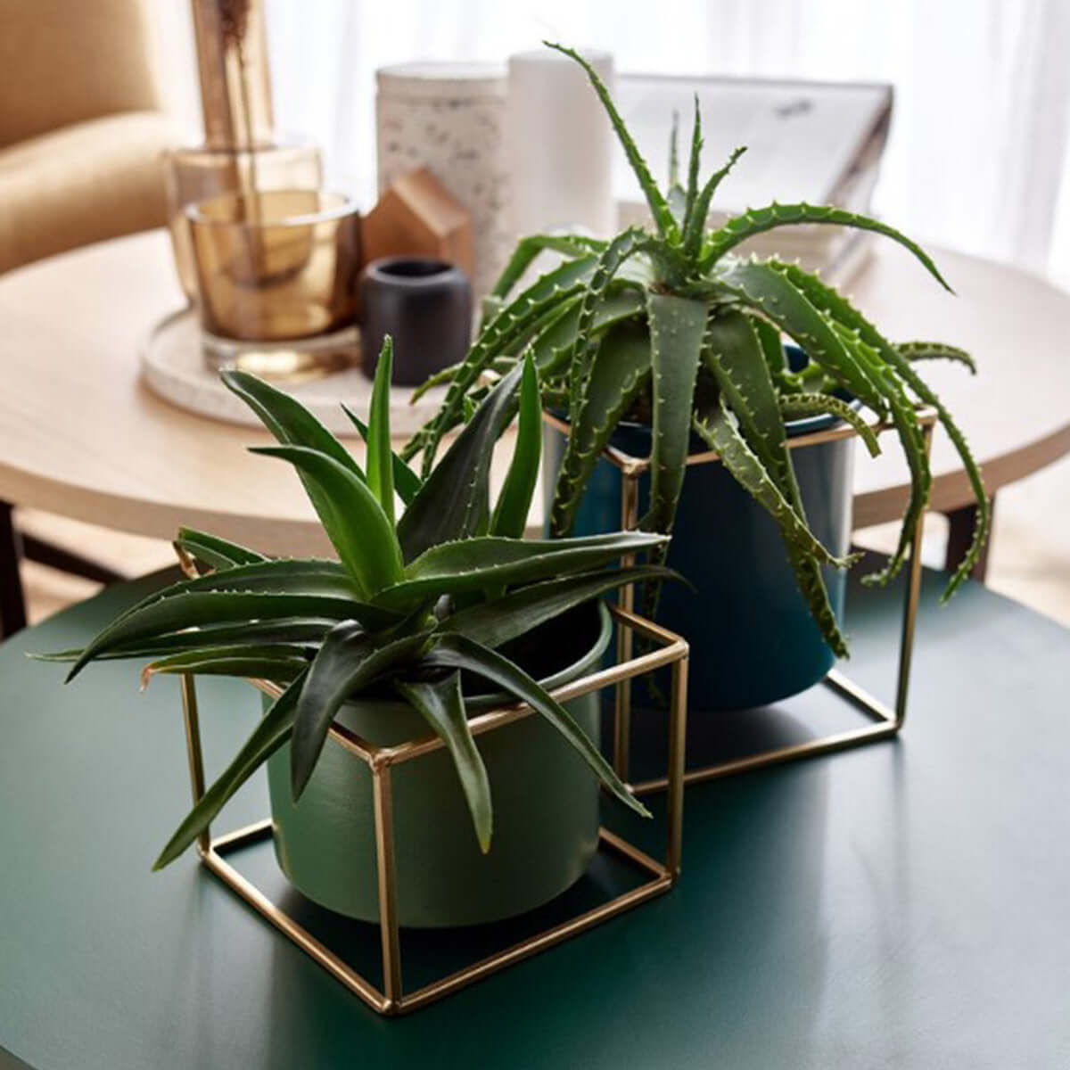 Металната поставка за саксија Grino е стилска и функционална декорација, погодна за комода, полица или прозорски праг. Зелената обвивка совршено се вклопува со златната метална рамка, додавајќи префинетост и елеганција на ентериерот.